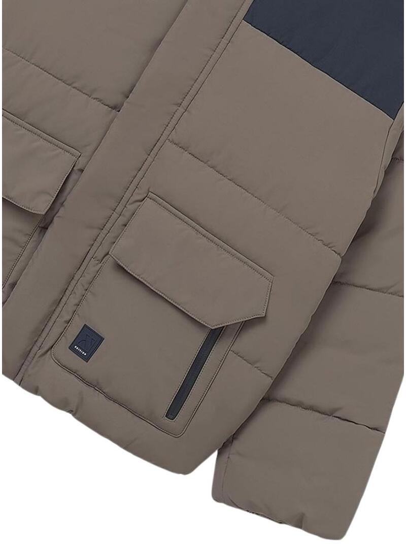 Giacca trapuntata Mayoral. Modello bicolore. Marrone e blu scuro. Collo alto. Chiusura con zip nascosta. Tasche laterali con patta e zip. Patch del marchio in gomma.