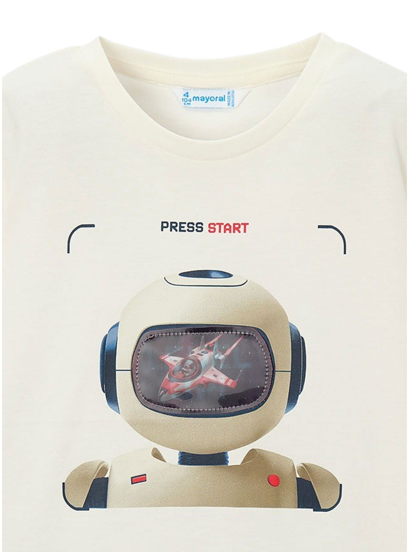 Maglietta Mayoral. Modello Robot. Colore beige. Collo rotondo. Manica corta. Vestibilità regolare. Illustrazione stampata sul davanti.