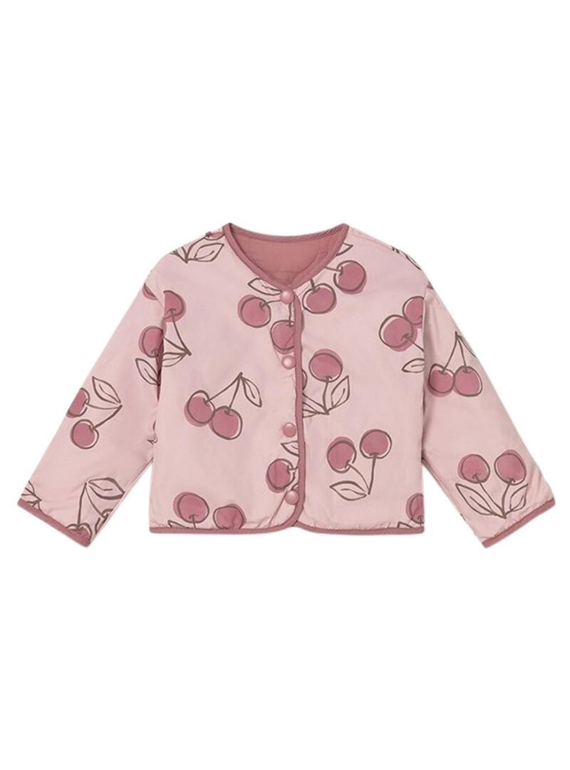 Giacca Mayoral. Modello reversibile. Colore rosa. Imbottitura geometrica. Tasche laterali. Patch del marchio. Chiusura con bottoni a pressione. Collo rotondo. Faccia liscia. Faccia con stampa maxi di ciliegie.
