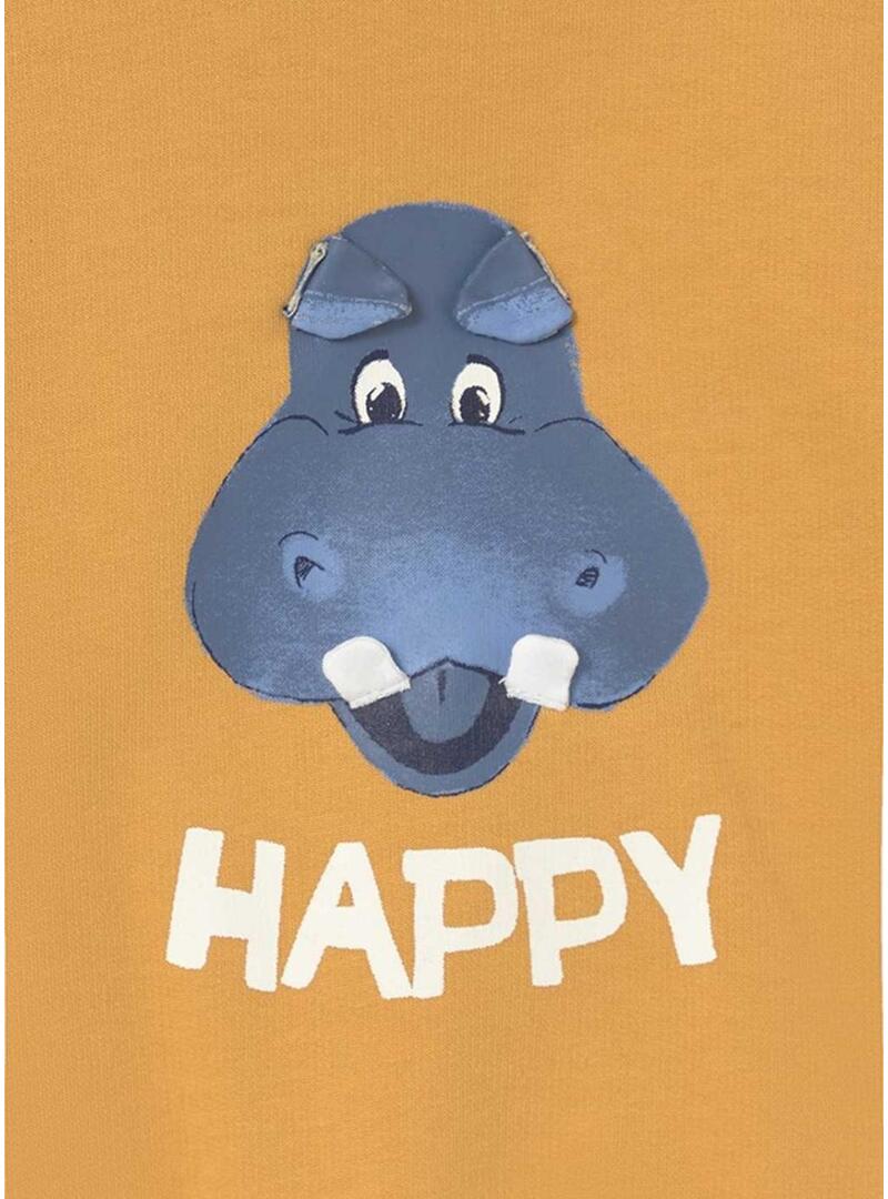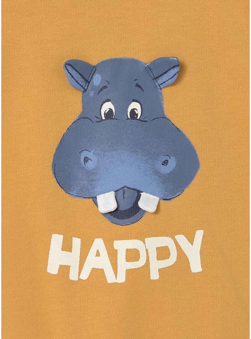 Felpa Mayoral. Modello Happy. Colore arancione. Collo rotondo con bottoni. Orli a costine. Vestibilità regolare. Illustrazione di un ippopotamo stampata sul davanti con orecchie in rilievo.