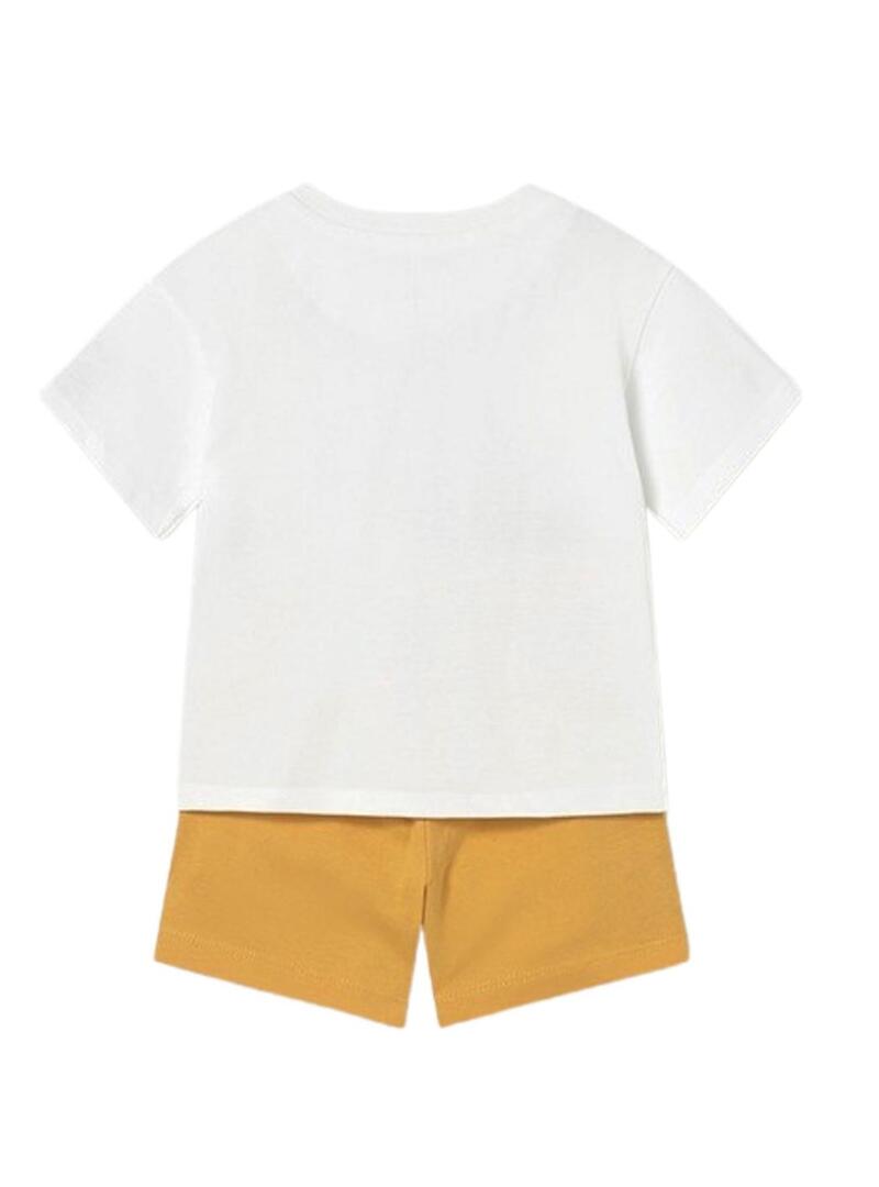 Set Mayoral. Modello Friends. Due pezzi. Maglietta bianca con stampa animale sul fondo. Pantaloncini arancioni con vita elastica.