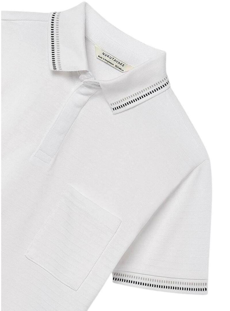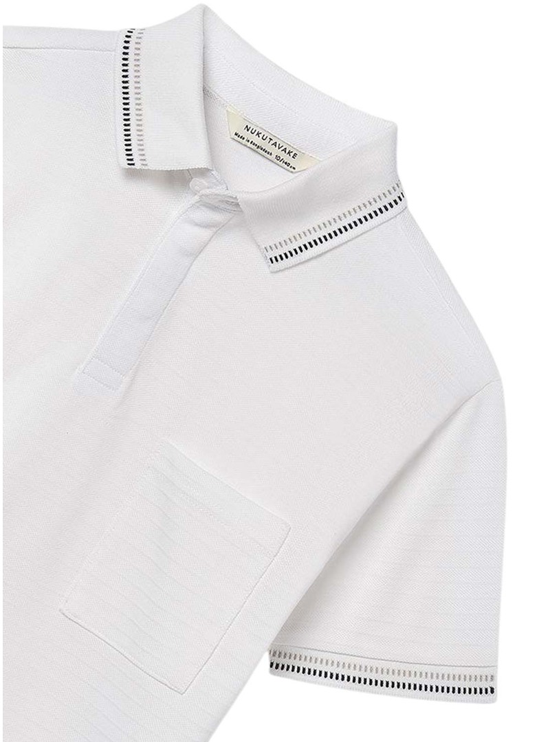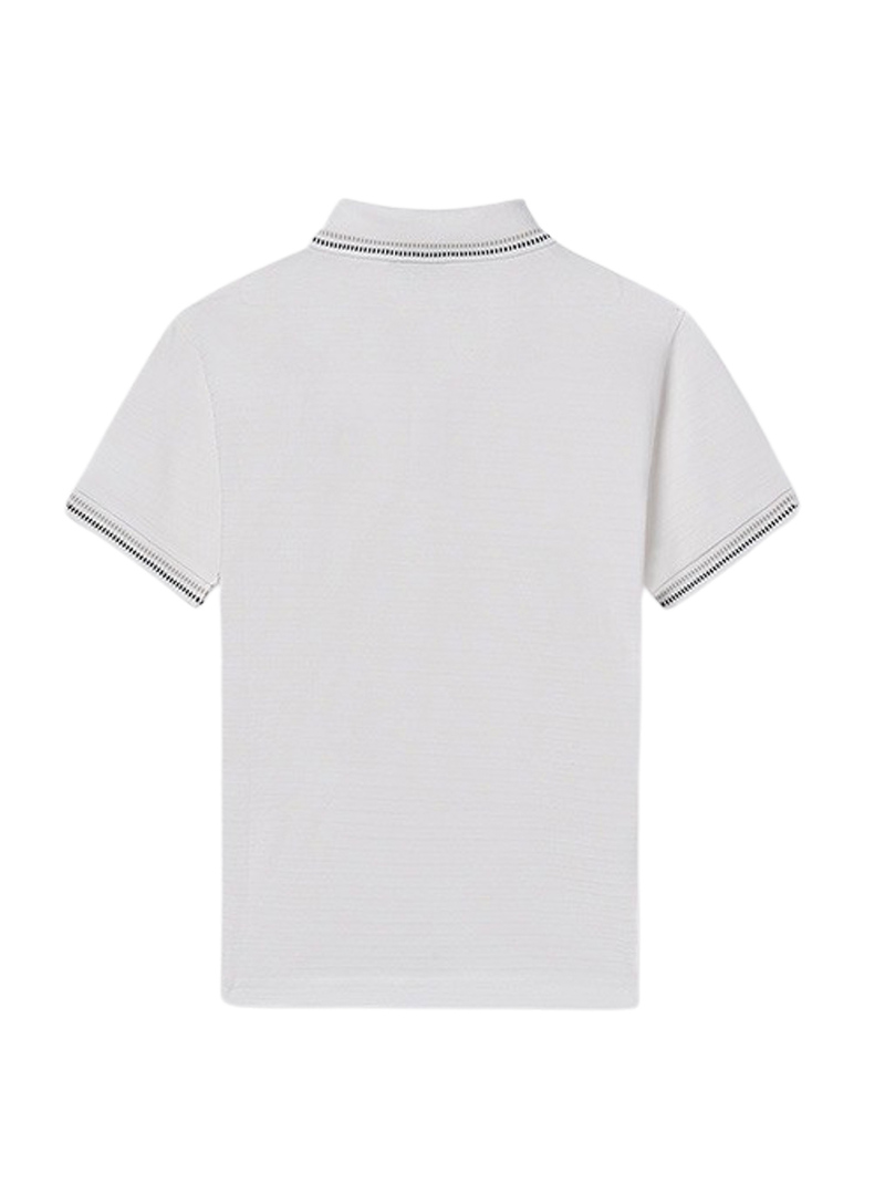 Polo Mayoral. Colore bianco. Strisce blu e grigie sul collo e alle estremità delle maniche. Colletto con bottoni nascosti. Manica corta. Tasca sul petto. Vestibilità regolare.