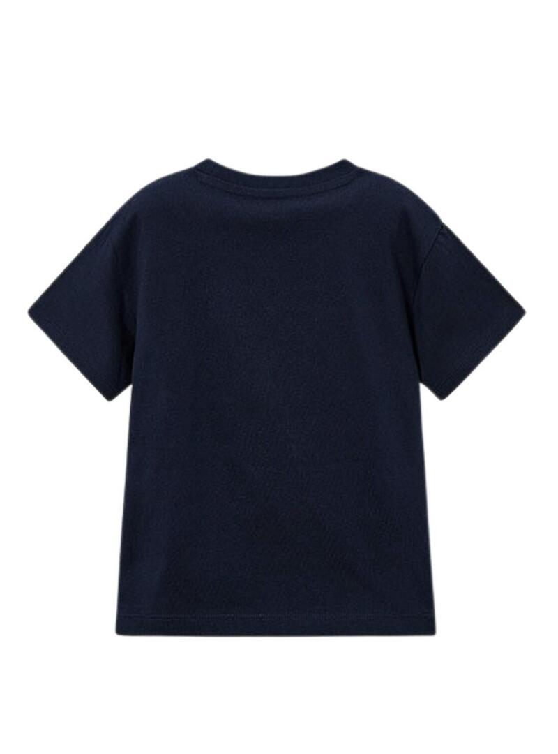 Maglietta Mayoral. Colore blu scuro. Collo rotondo. Manica corta. Modello Football club. Stampa a tema calcio sul petto. Realizzata in cotone dell'iniziativa Better Cotton.