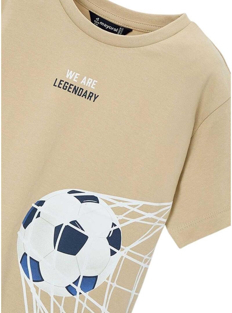 Maglietta Mayoral. Colore cammello. Collo rotondo. Manica corta. Modello Lengendary. Stampa a tema calcio sul petto. Realizzata in cotone dell'iniziativa Better Cotton.