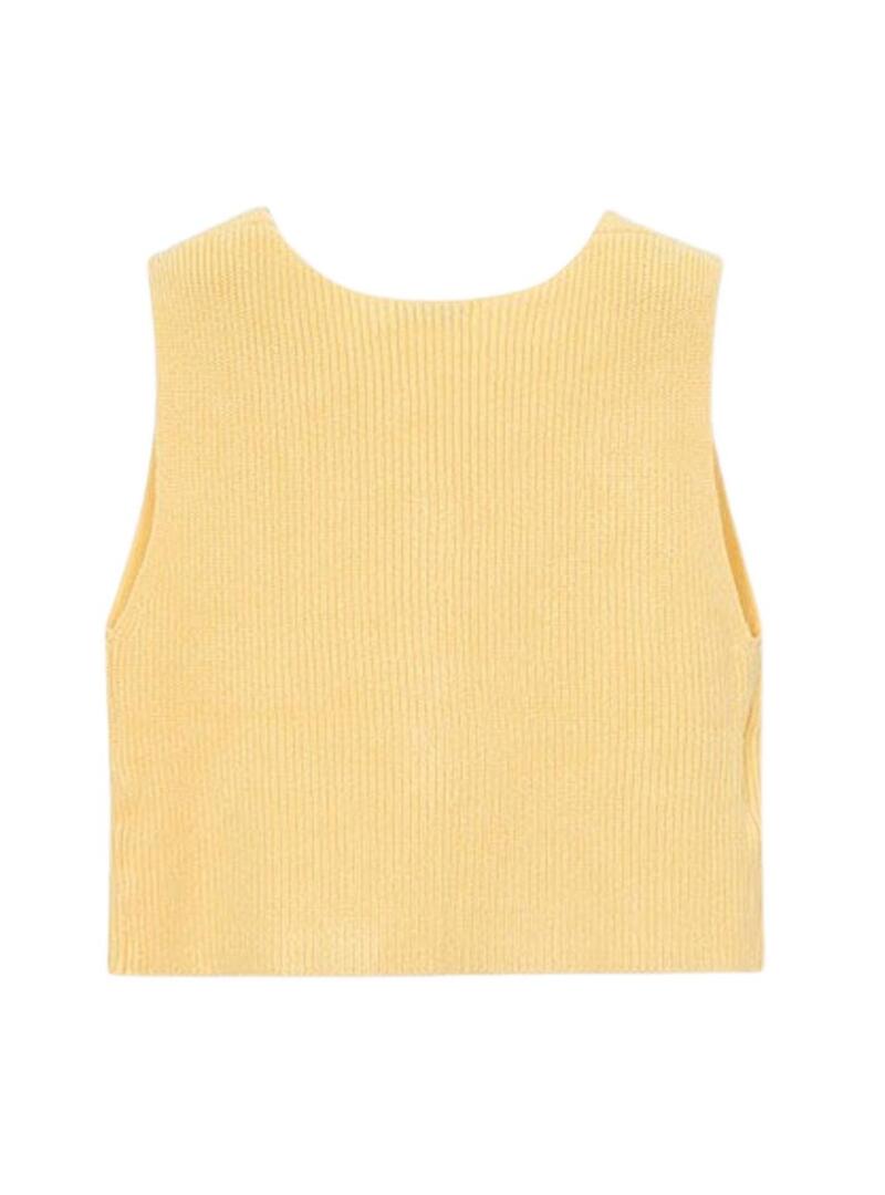Gilet Mayoral. Modello a maglia tricot. Colore giallo. Senza maniche. Taglio corto. Scollo a V. Chiusura con due bottoni. Tessuto a coste.