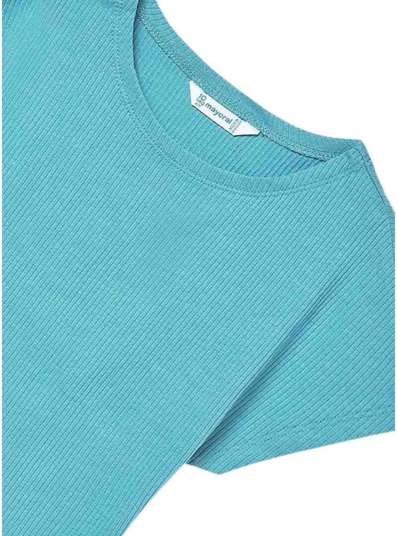 Maglietta Mayoral. Modello a coste. Colore blu. Collo rotondo. Manica corta. Logo circolare sul fondo. Taglio aderente. Stile basic.