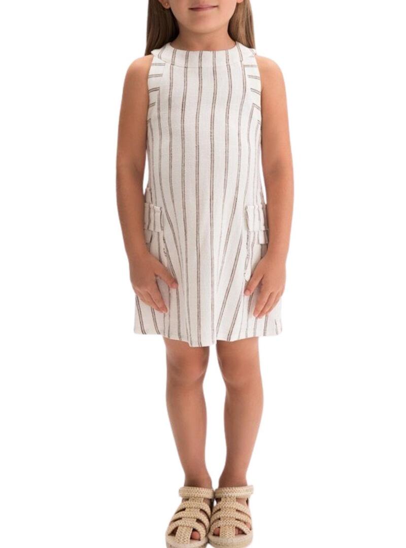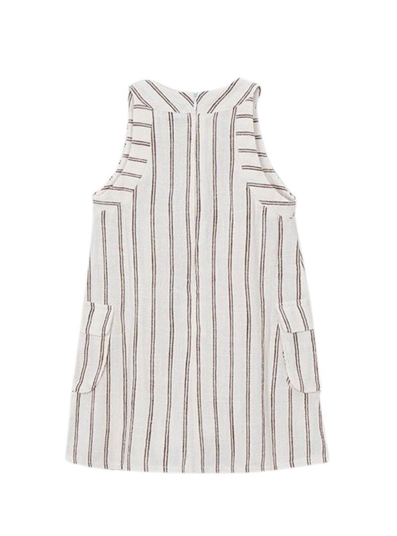 Abito Mayoral. Realizzato in lino. Stampato a righe verticali. Colletto rotondo. Taglio mini. Tasche laterali con pattina. Senza maniche.