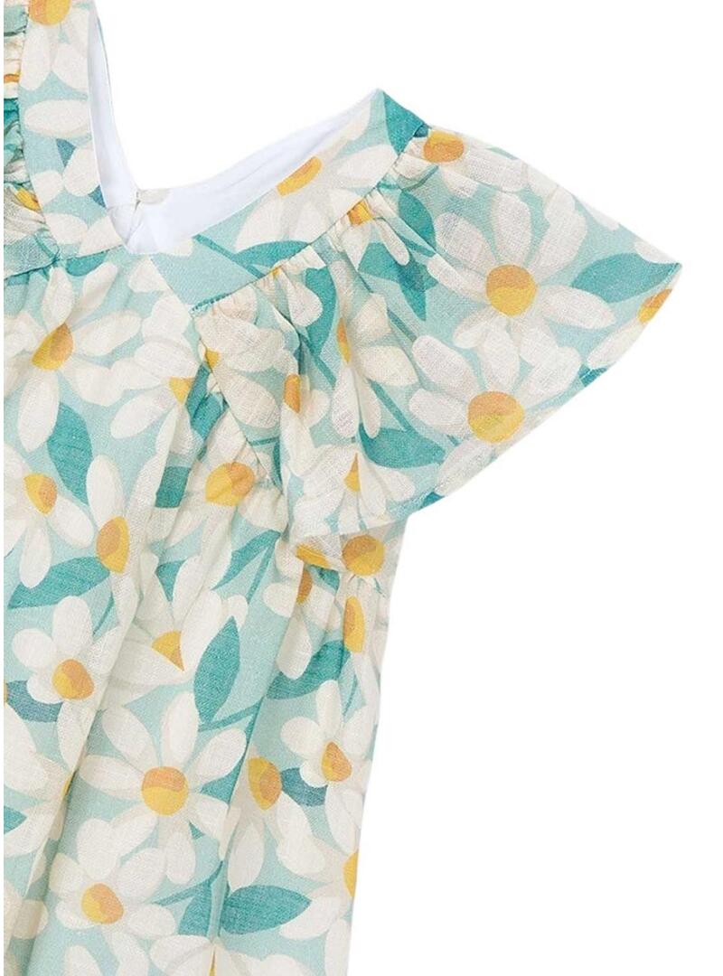Abito Mayoral. Stampato con margherite. Color blu, bianco e giallo. Maniche a volant. Chiusura con bottone sul retro. Taglio a linea A.