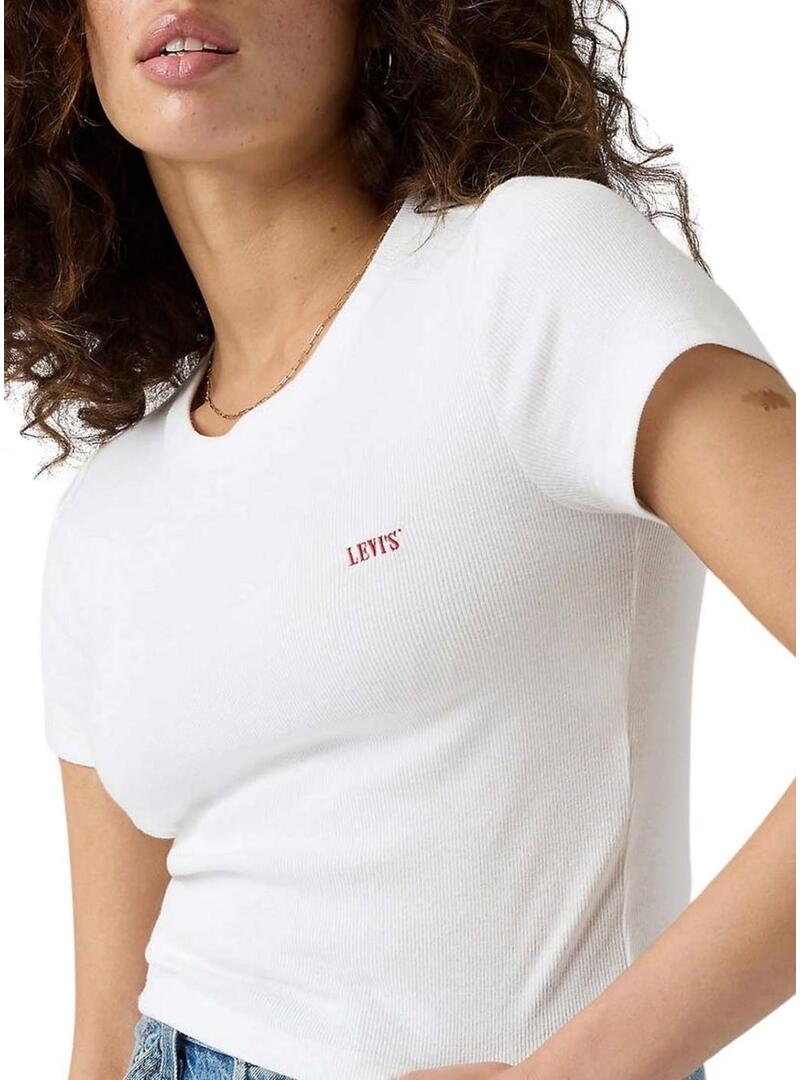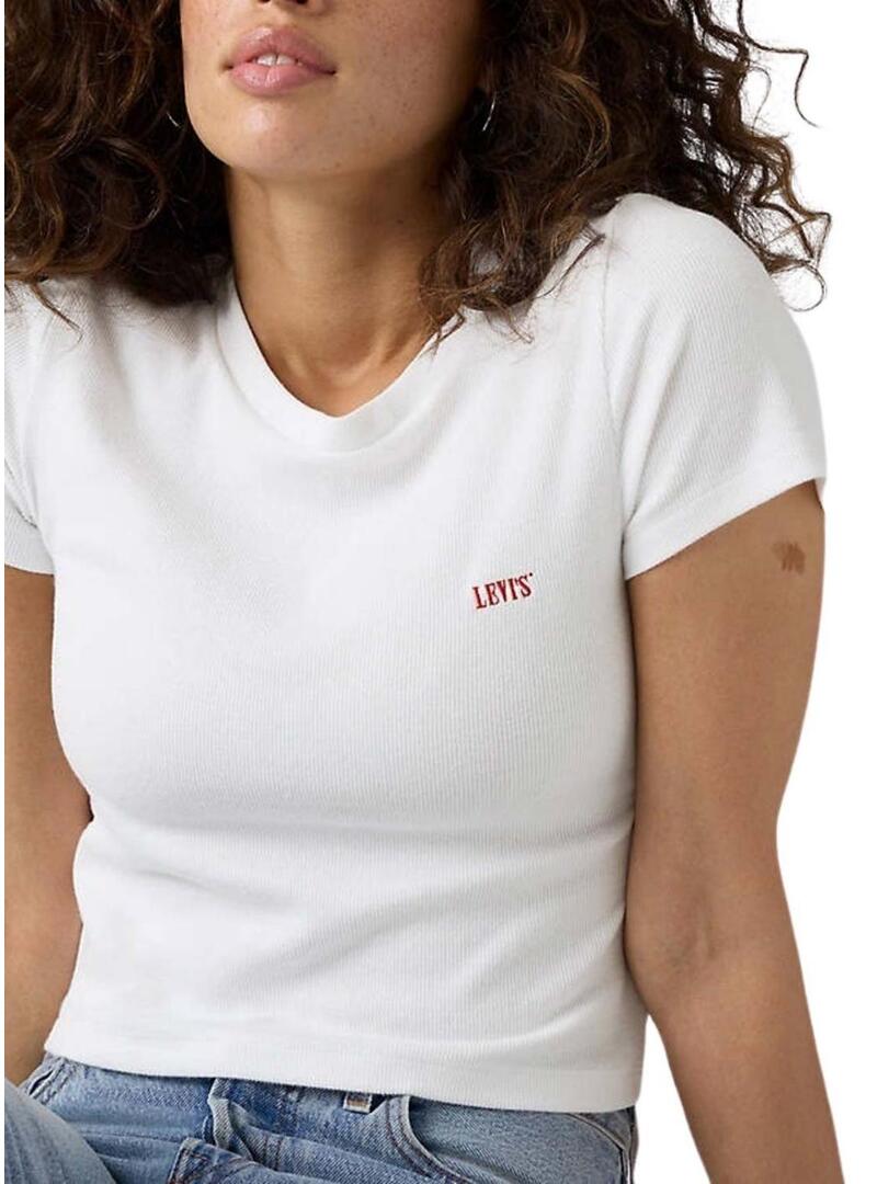 Maglietta Levis. Modello Sporty. Colore bianco. Tessuto a coste. Taglio aderente. Manica corta. Collo rotondo. Logo ricamato sul petto in colore rosso.