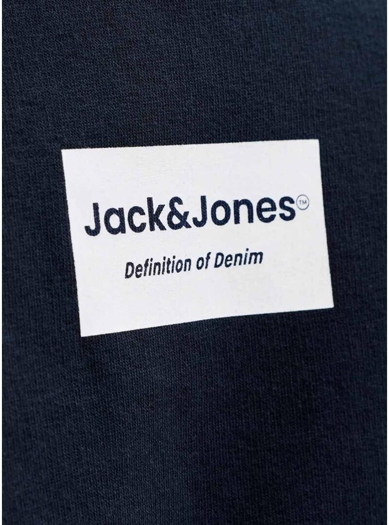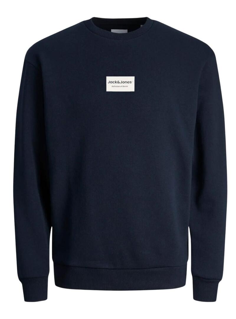 Felpa Jack and Jones. Modello Frank. Colore blu scuro. Collo rotondo. Manica lunga. Orli a costine. Vestibilità regolare. Logo stampato sul petto in bianco.