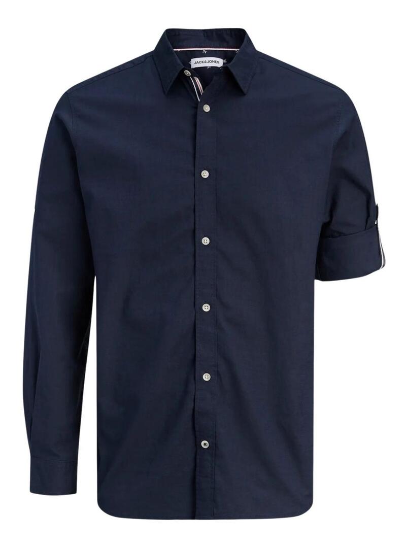 Camicia Jack and Jones. Modello Henry. Colore blu navy. Vestibilità regolare. Stile basico. Manica lunga trasformabile con cinturino. Cotone leggero traspirante. Nastro in contrasto bianco e rosso.