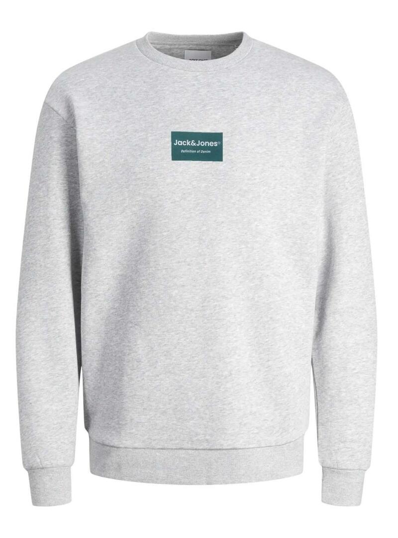 Felpa Jack and Jones. Modello Frank. Colore grigio mélange. Collo rotondo. Manica lunga. Orli a costine. Vestibilità regolare. Logo stampato sul petto in colore turchese.
