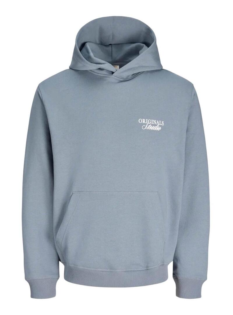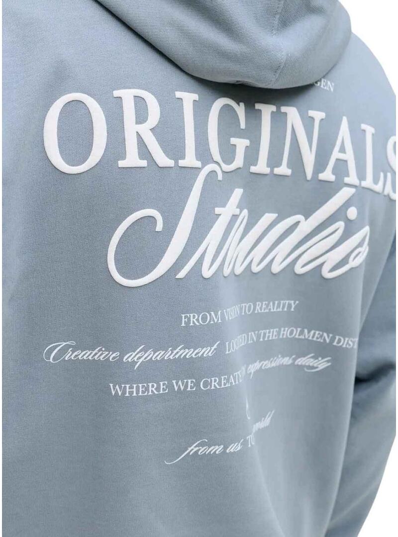 Felpa Jack and Jones. Modello Norrebro. Colore blu chiaro. Con cappuccio. Orli a costine. Vestibilità regolare. Messaggio vintage stampato sul petto e sulla schiena. Dettagli in bianco. Tasca a marsupio.