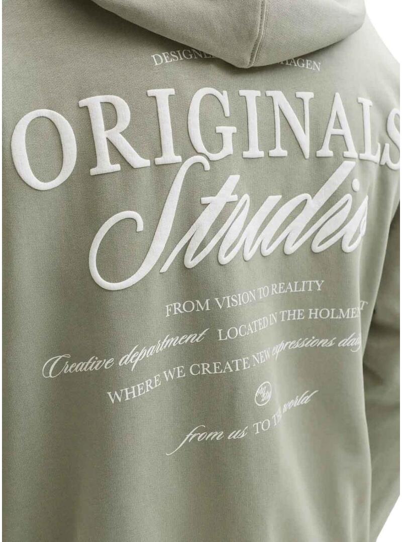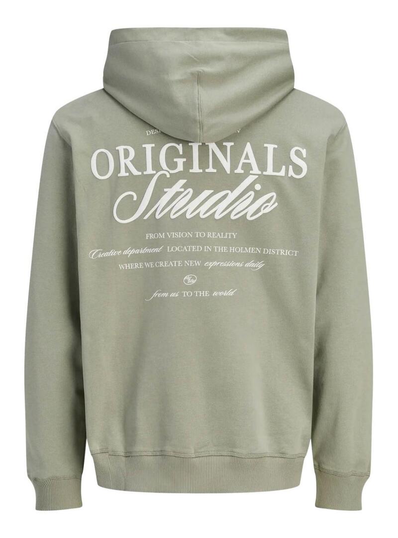 Felpa Jack and Jones. Modello Norrebro. Colore verde salvia. Con cappuccio. Orli a costine. Vestibilità regolare. Messaggio vintage stampato sul petto e sulla schiena. Dettagli in bianco. Tasca a marsupio.