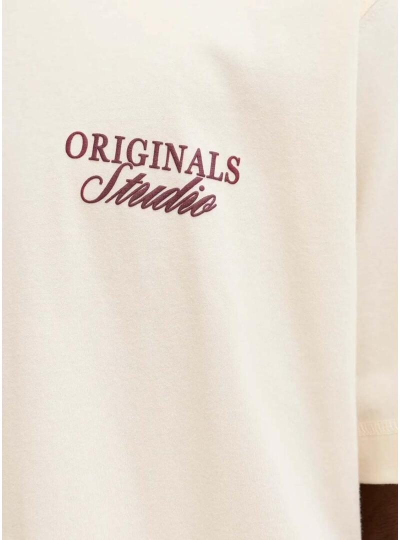 Maglietta Jack and Jones. Modello Norrebro. Colore beige. Collo rotondo. Manica corta. Vestibilità oversize. Messaggio stampato sul petto e sulla schiena in stile vintage. Dettagli in rosso.