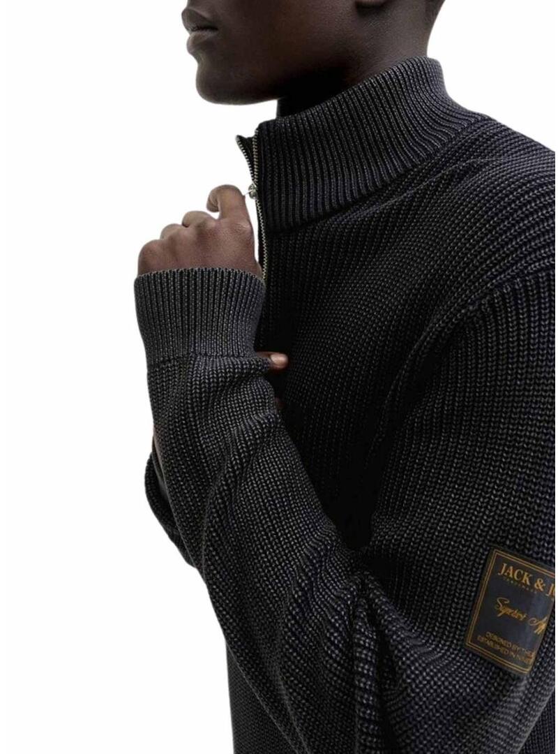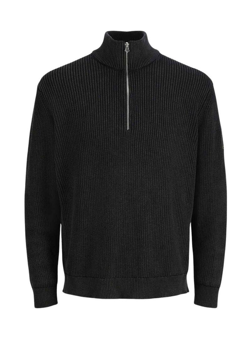 Maglia Jack and Jones. Modello Detroit. Colore nero. Colletto alto con mezza zip. Taglio regolare. Manica lunga. Estremità elastiche. Tessuto a coste.