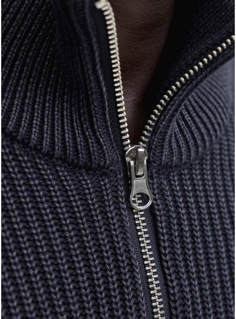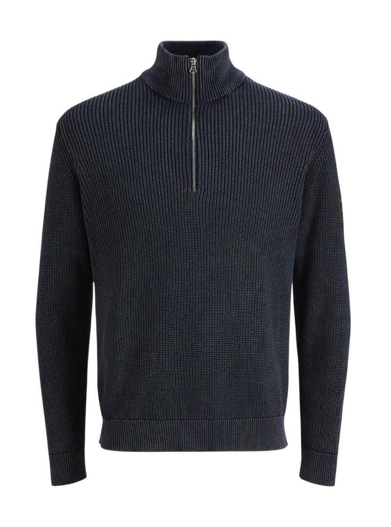 Maglia Jack and Jones. Modello Detroit. Colore blu scuro. Stile basico. Collo alto con mezza zip. Vestibilità regolare. Maniche lunghe. Estremità elastiche. Tessuto a coste.