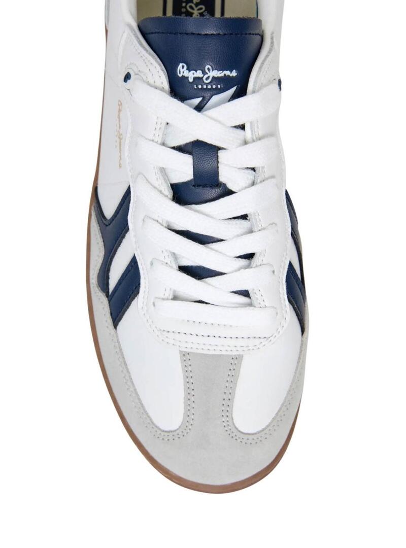 Scarpa Pepe Jeans. Modello Ball Essence. Colore bianco. Parte superiore in pelle. Pannelli in camoscio grigio. Dettagli in colore blu. Logo termosaldato. Chiusura con lacci. Soletta termoformata e removibile. Suola in gomma di colore naturale.
