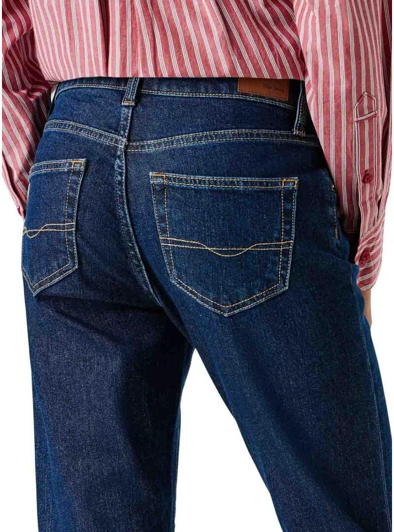 Pantaloni in denim Pepe Jeans. Modello Grace. Denim scuro. Cavallo medio. Chiusura con bottone e zip. Gamba dritta. Cinque tasche. Cuciture a contrasto. Tessuto denim elasticizzato. Patch del marchio in vita.