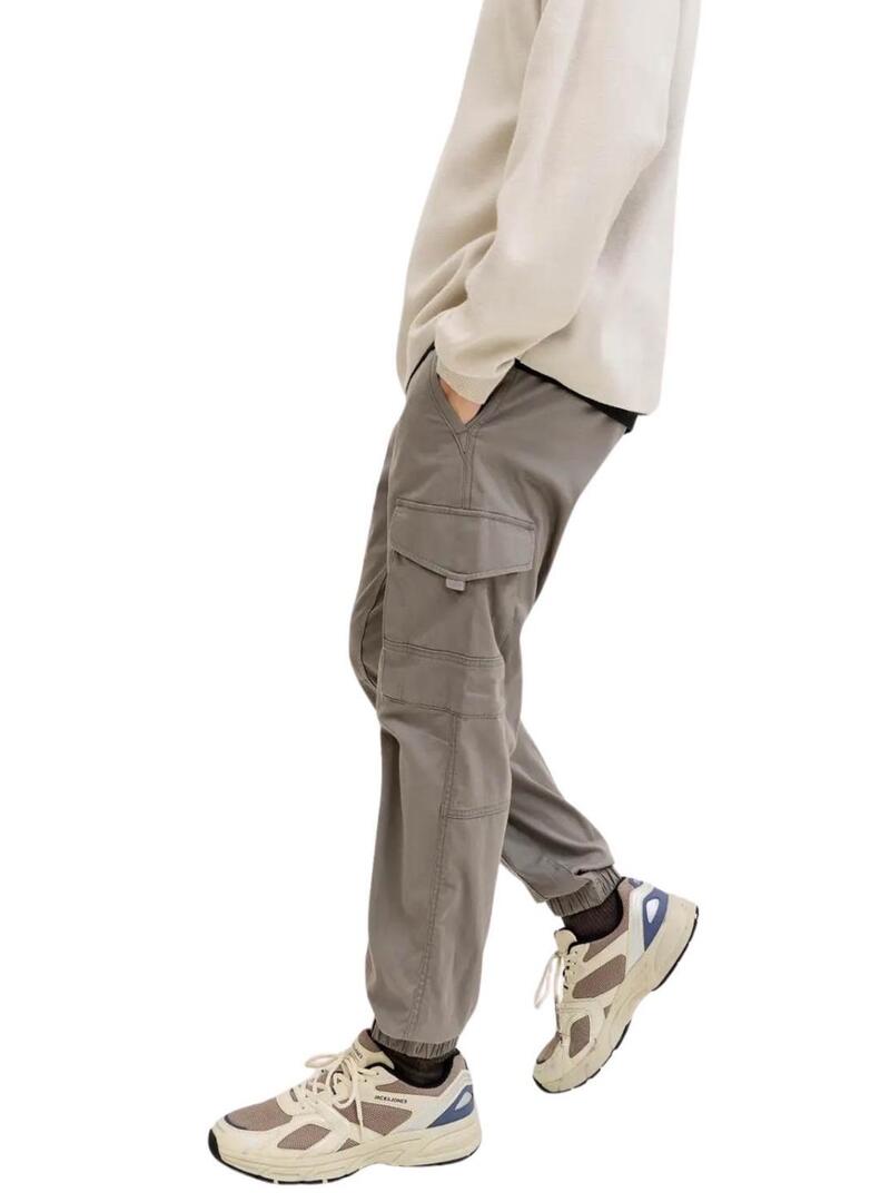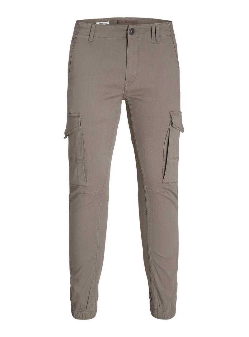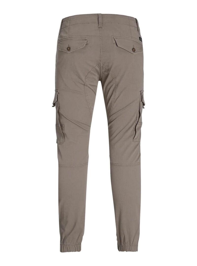 Pantaloni cargo Jack and Jones. Modello Paul. Colore beige. Chiusura con bottone e zip. Fondo elastico con polsino. Tasche laterali. Tasche cargo con patta. Vestibilità regolare.