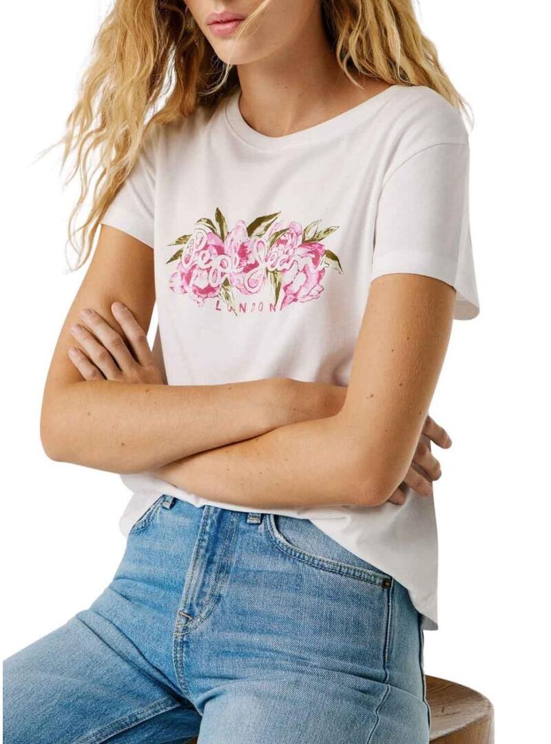 Maglietta Pepe Jeans. Modello Mahina. Colore bianco. Logo stampato sul petto con fiori in rosa e verde. Vestibilità regolare. Manica corta. Collo rotondo.