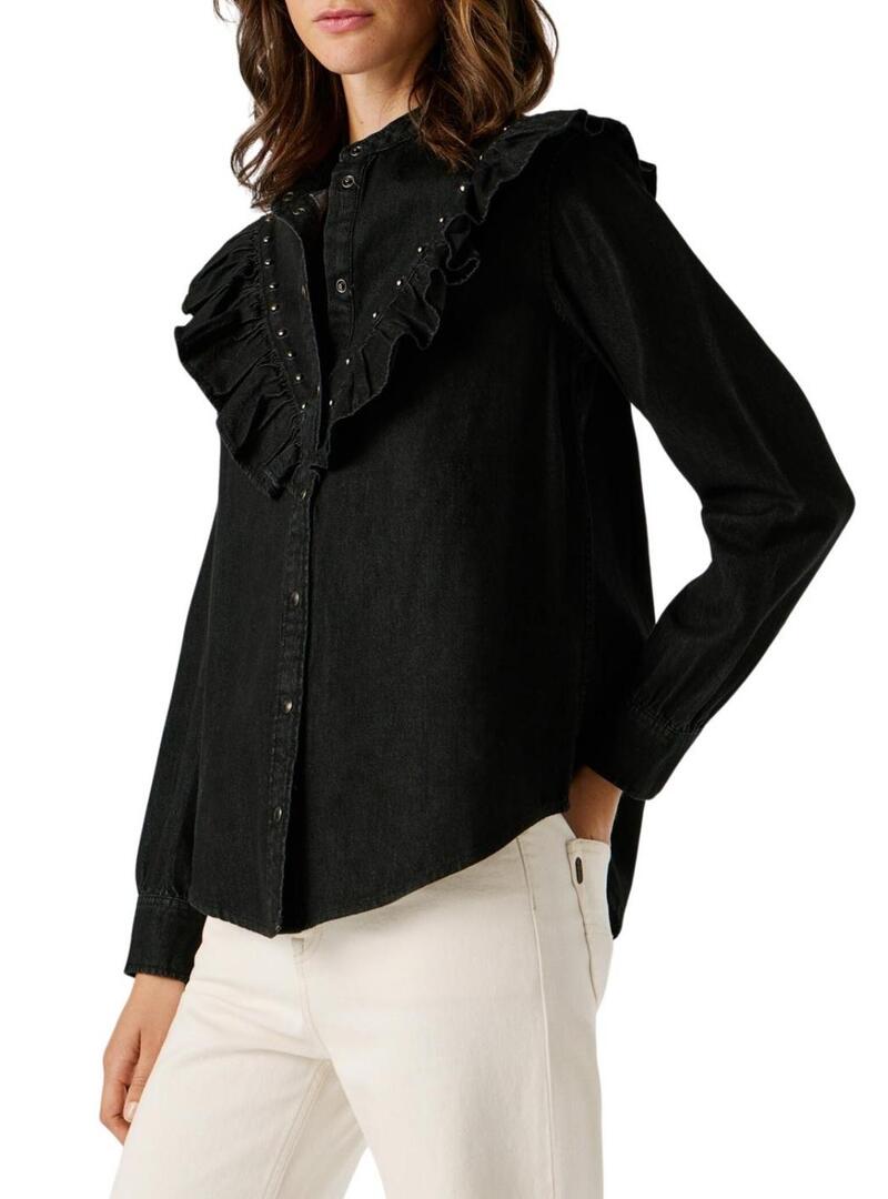 Camicia in denim Pepe Jeans. Modello Katia. Colore nero. Colletto mao. Chiusura con bottoni a pressione. Manica lunga. Pettorina con volant e borchie metalliche. Vestibilità dritta.