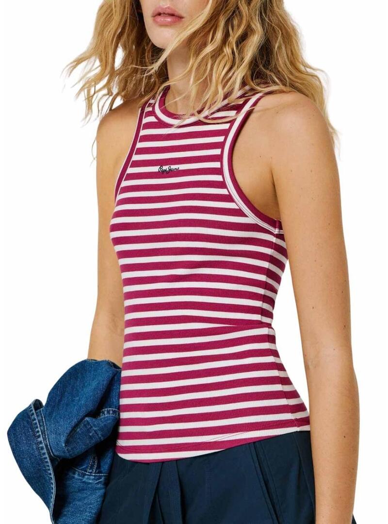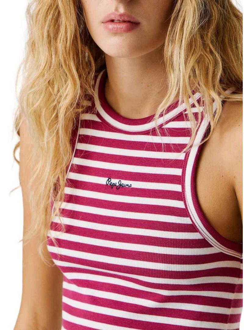 Maglietta Pepe Jeans. Modello Marian. Colore rosa fucsia e bianco. Collo rotondo. Senza maniche. Canotta. Logo sul petto. Tessuto a righe costato ed elastico.