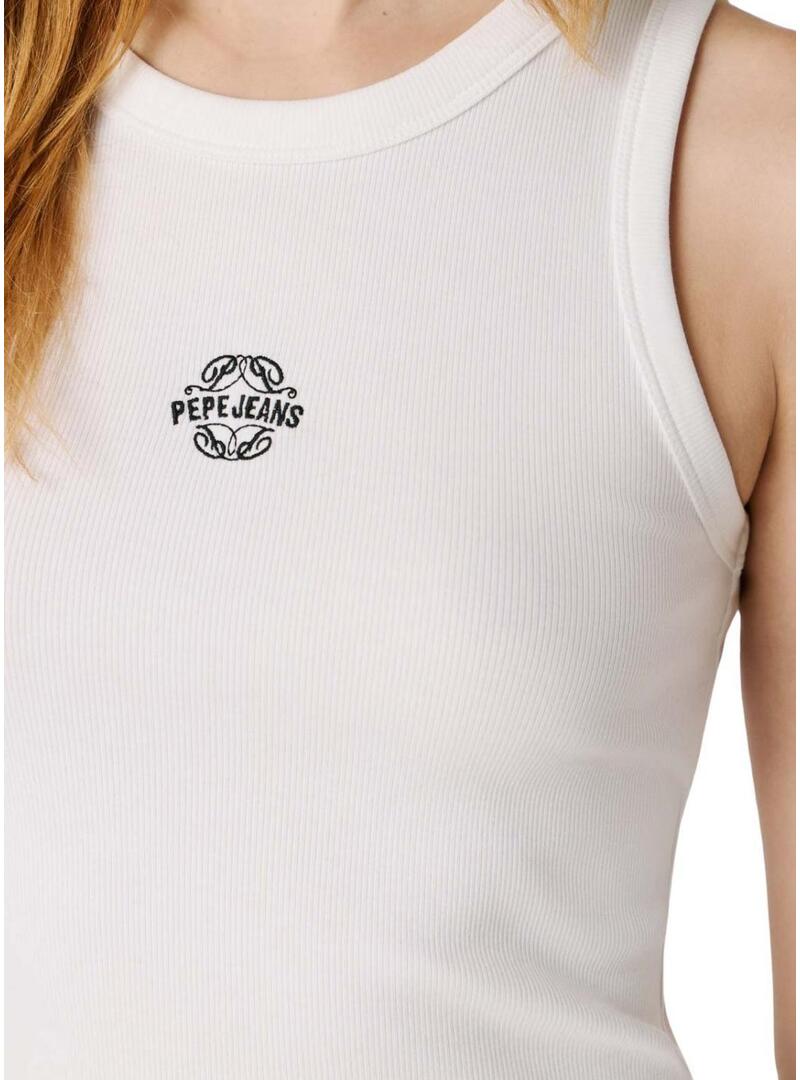 Maglietta Pepe Jeans. Modello Phoenix. Colore bianco. Collo rotondo. Senza maniche. Stile tank top. Tessuto a coste elastico. Taglio aderente. Logo ricamato in nero al centro del petto.