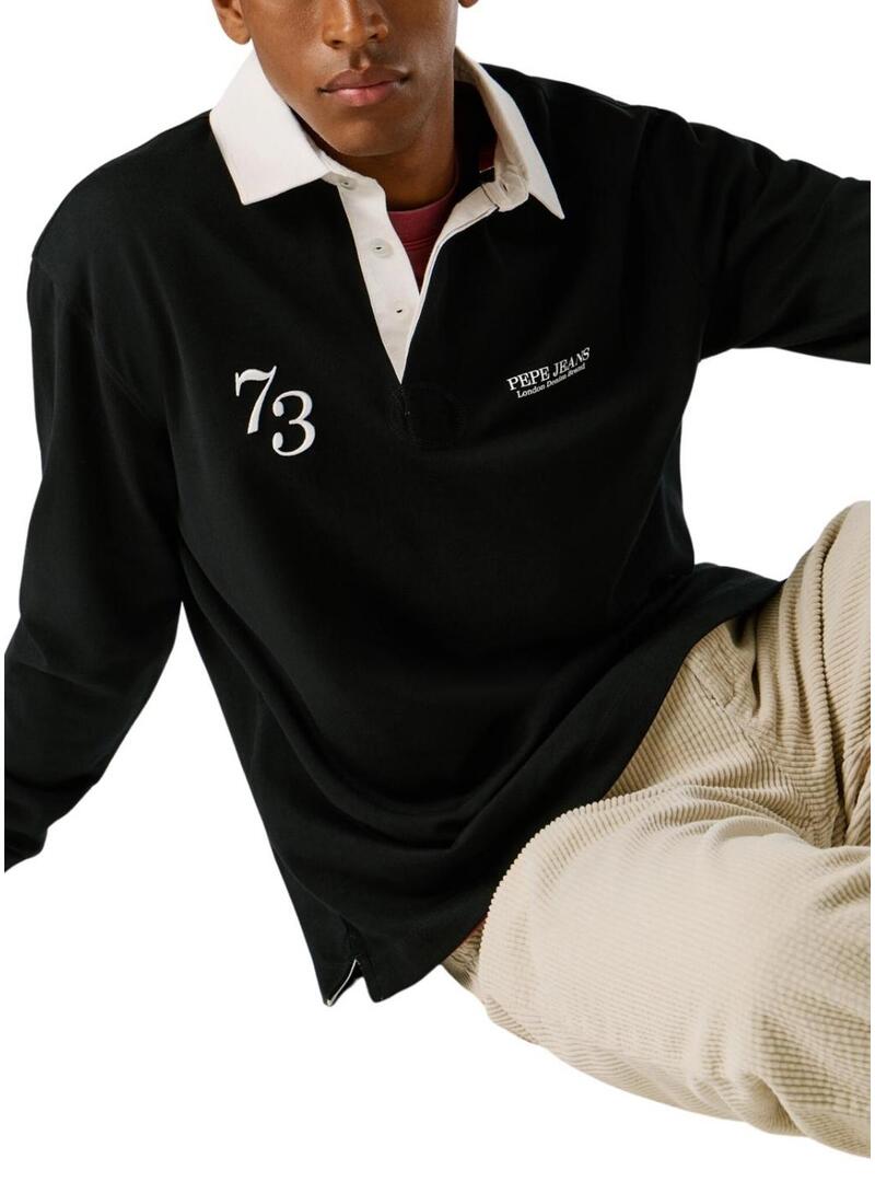 Polo Pepe Jeans. Modello Cameron. Colore nero. Colletto in bianco con chiusura a due bottoni. Logo stampato sul petto. Numero 73 stampato in bianco. Vestibilità dritta.