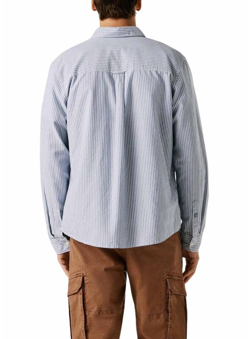 Camicia Pepe Jeans. Modello Prescot. Colore blu. Righe verticali bianche. Tasca applicata sul petto con etichetta del marchio. Colletto a bottoni. Vestibilità regolare. Chiusura frontale.