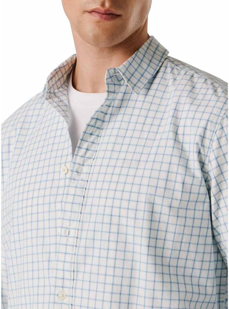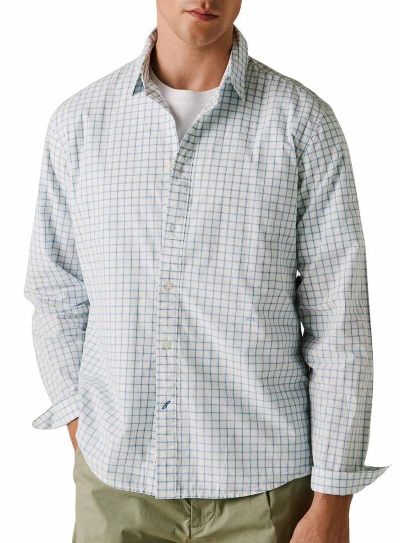 Camicia Pepe Jeans. Modello Presley. Colore bianco e blu. Stampato geometrico a quadretti. Etichetta del marchio sulla chiusura. Iniziali PJL ricamate sotto il seno sinistro in tinta. Vestibilità regolare.