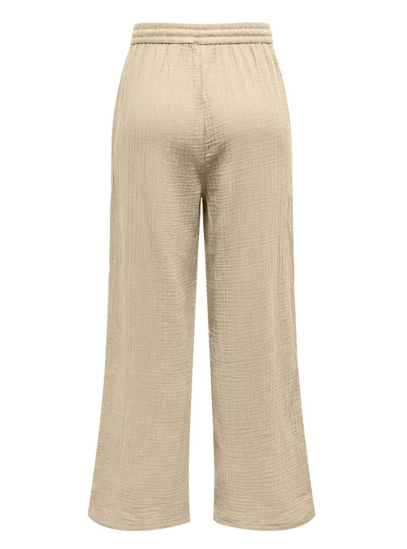 Pantaloni Only. Modello Thyra. Colore beige. Gamba larga. Vita elastica con cordino regolabile. Tasche laterali. Tessuto morbido e traspirante.