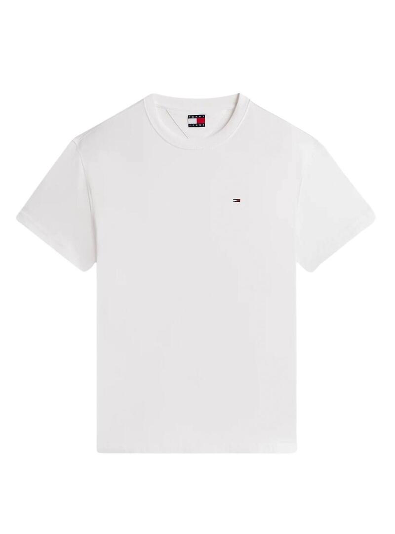 Maglietta Tommy Jeans. Colore bianco. Manica corta. Ricamo di Tommy sul petto. Taglio regolare. Il modello indossa la taglia M.