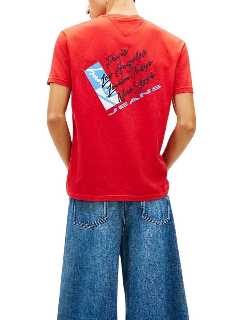 Maglietta Tommy Jeans. Colore rosso. Collo rotondo. Taglio regolare. Maniche corte. Logo di Tommy Jeans sul petto. Logo oversize sul retro. Bandiera ricamata sulla manica. Il modello indossa la taglia M.