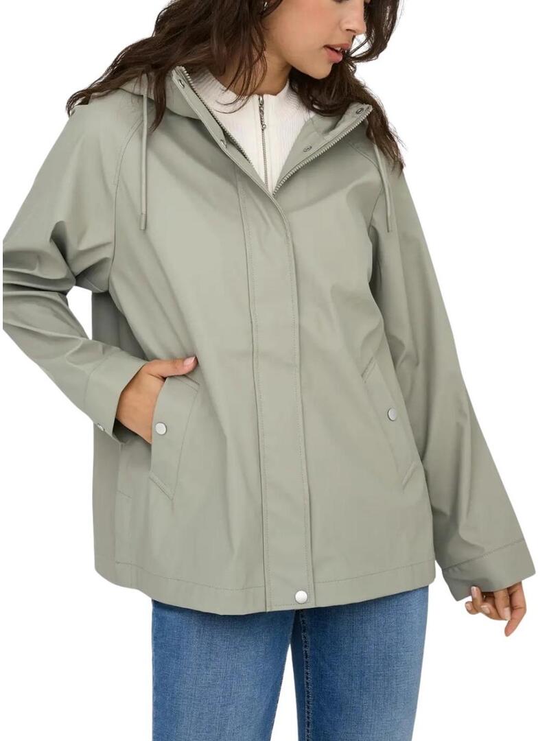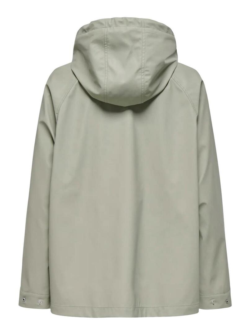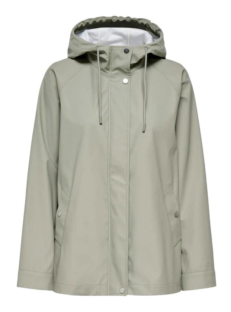 Giubbotto a vento Only. Modello Elisa. Colore verde. Tessuto impermeabile. Cappuccio regolabile con cordino. Chiusura con zip e bottoni. Tasche con bottoni a pressione. Polsini regolabili con bottoni a pressione.