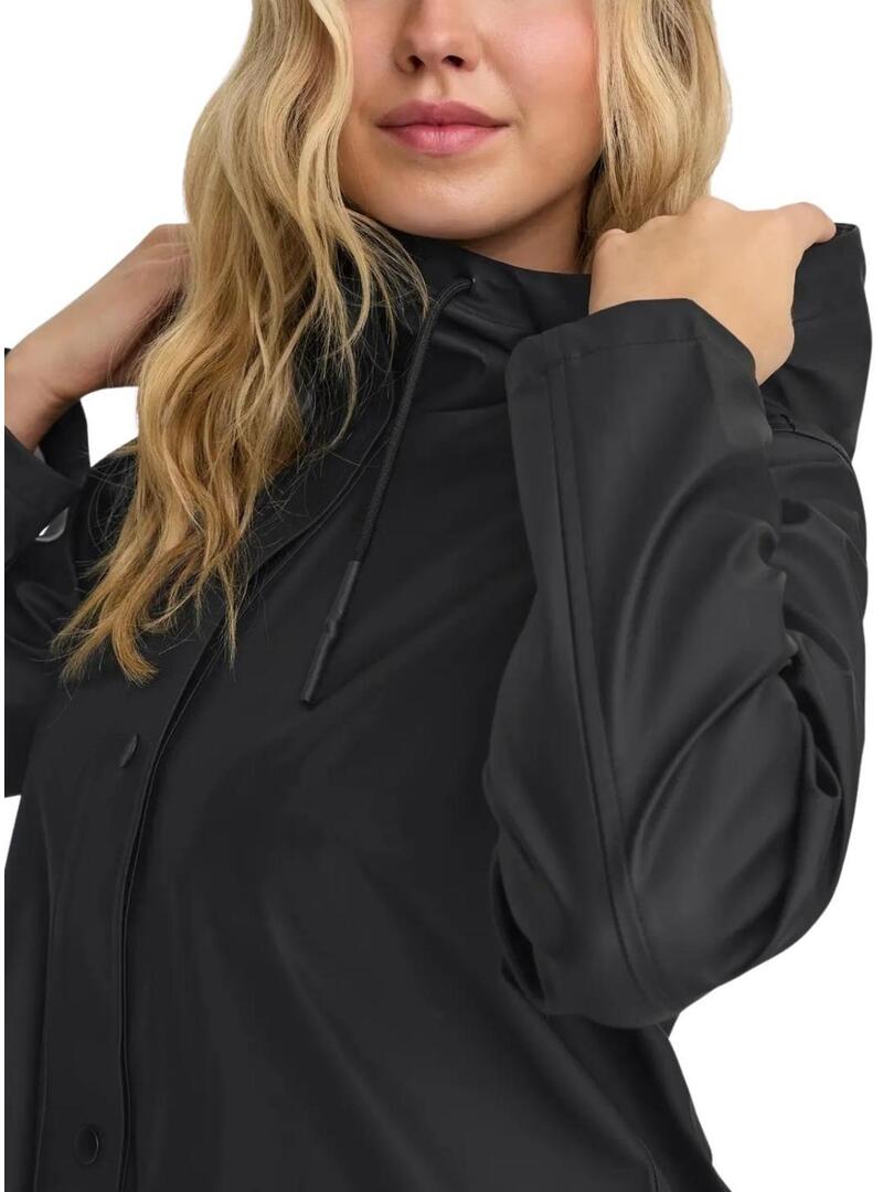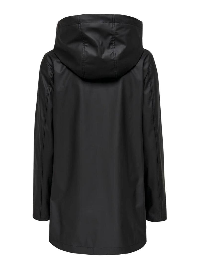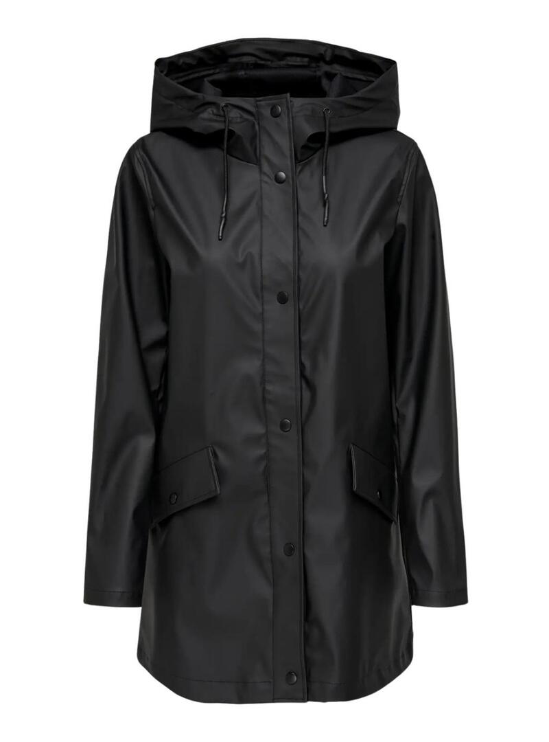 Impermeabile Only. Modello Elisa. Colore nero. Cappuccio regolabile con cordino. Chiusura a bottoni a pressione. Due tasche frontali con chiusura a bottoni a pressione. Tessuto impermeabile.