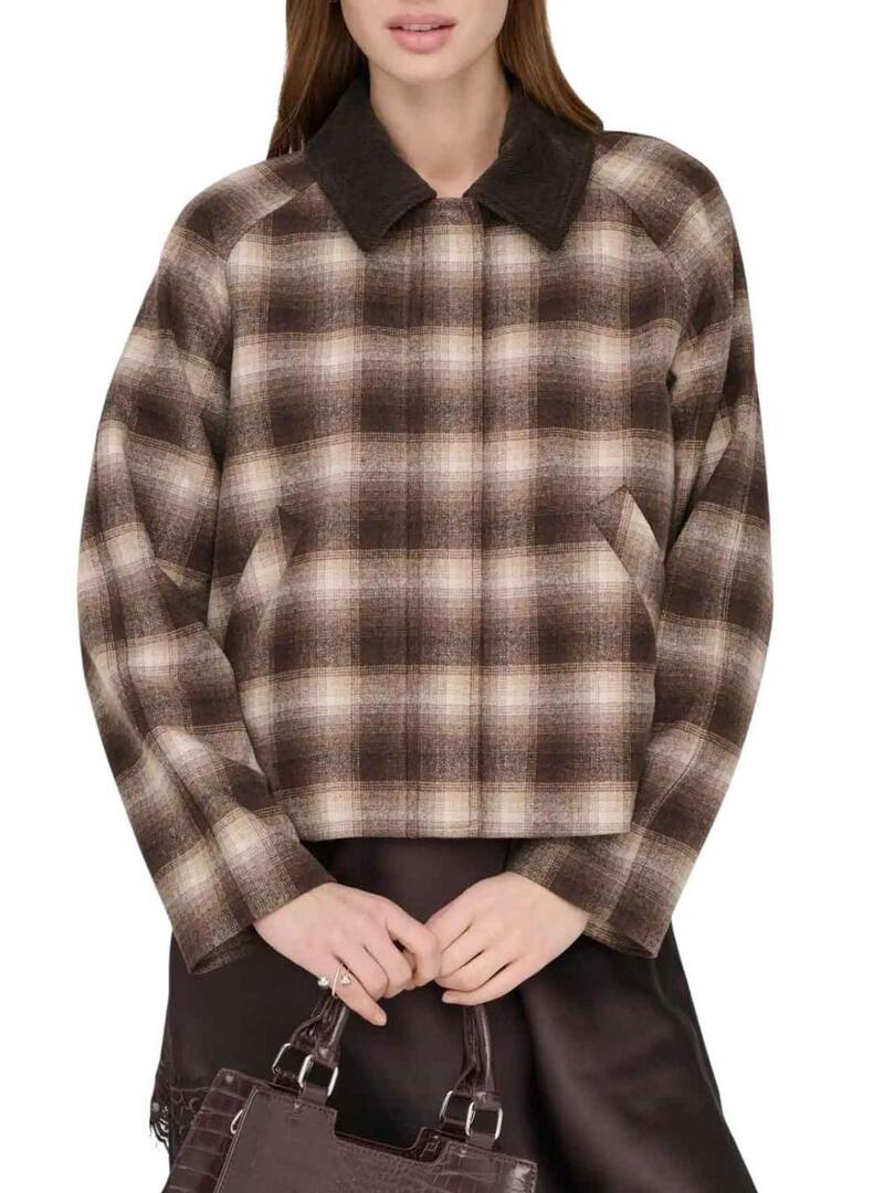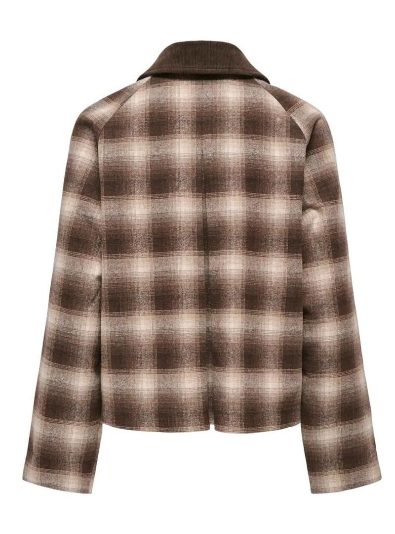 Giacca Only. Modello Kine. Colletto italiano in velluto a coste. Tessuto a quadretti. Due tasche frontali. Spacco posteriore. Lunghezza corta.