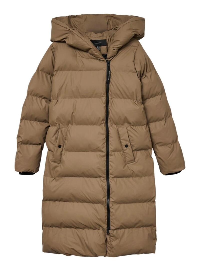 Cappotto Vero Moda. Modello Miriam. Colore cammello. Lungo e trapuntato. Con cappuccio. Chiusura con zip. Tasche frontali con bottoni a pressione. Fodera interna.