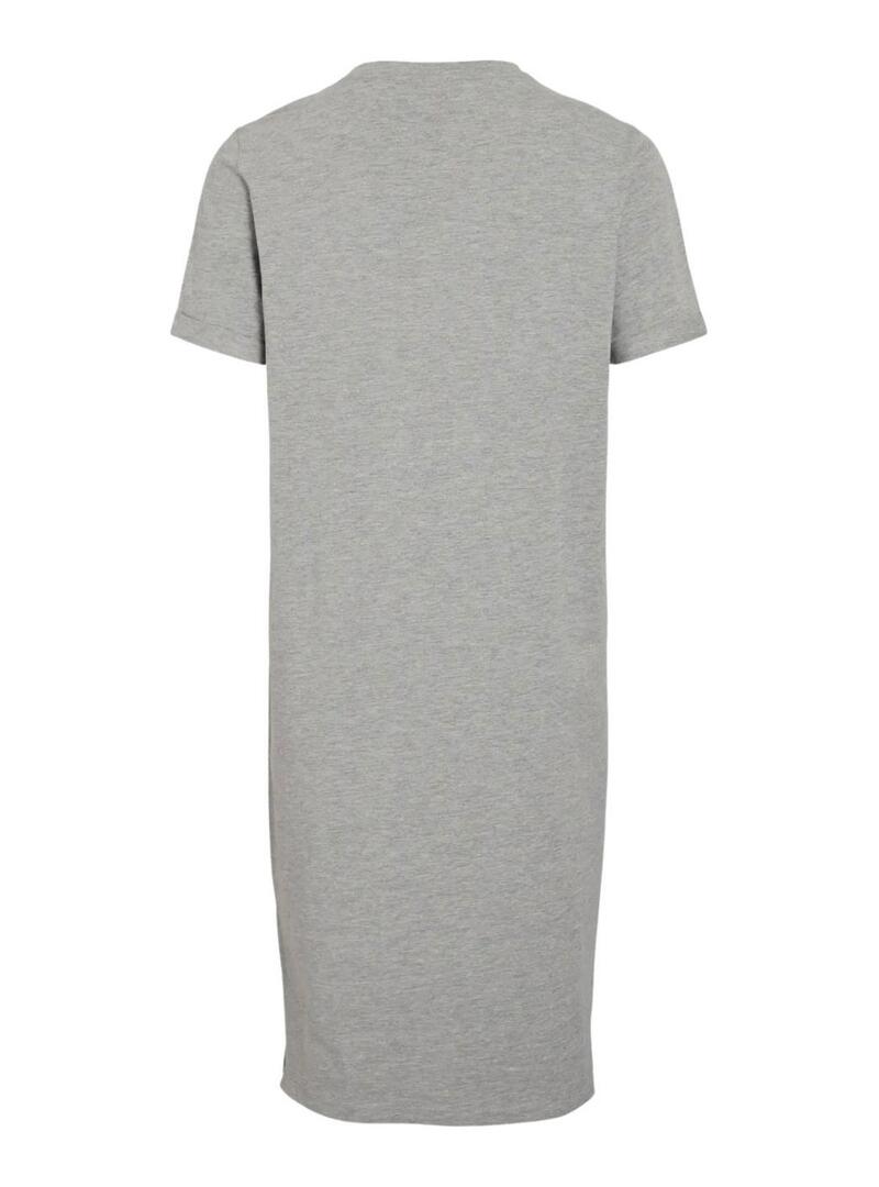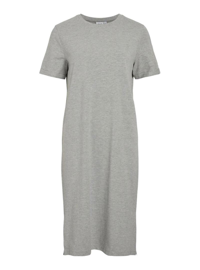 Abito Vila. Modello Nora. Colore grigio mélange. Colletto rotondo. Manica corta. Aperture laterali sul fondo. Lunghezza al ginocchio. Taglio ampio.