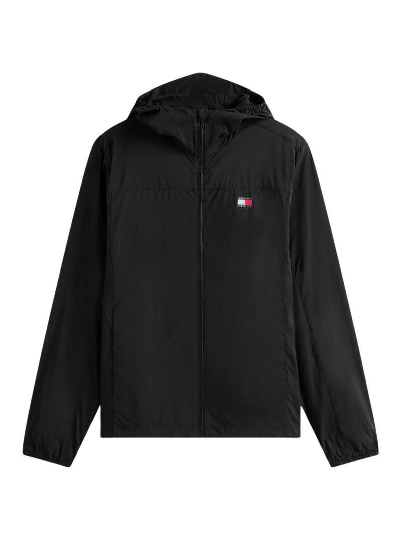 Giacca Tommy Jeans. Colore nero. Resistente al vento. Tessuto Ripstop resistente. Idrorepellente. Con cappuccio. Chiusura con zip. Due tasche laterali. Tasca interna. Patch di Tommy sul petto. Taglio slim. Il modello indossa la taglia M.