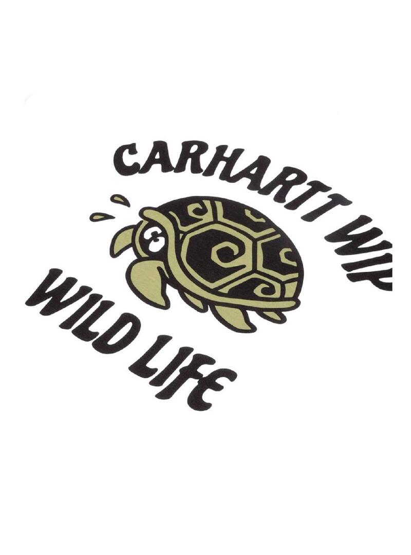 Maglietta Carhartt. Modello Wild Life. Colore bianco. Collo rotondo a costine. Manica corta. Tessuto in maglia di cotone organico di peso medio. Taglio ampio. Grafiche stampate sul petto e sulla schiena.