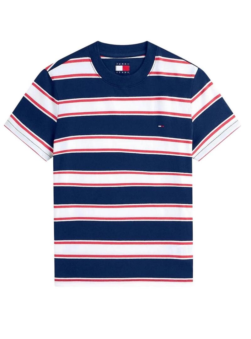 Maglietta Tommy Jeans. Stampato a righe. Colore navy. Collo rotondo. Manica corta. Taglio regolare. Logo Tommy ricamato sul petto.