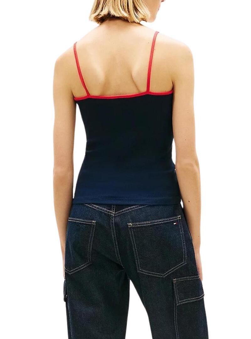 Top Tommy Jeans. Colore blu marino. Vestibilità slim. Con bretelle a contrasto. Bandiera di Tommy Jeans ricamata sul petto. La modella indossa la taglia S.