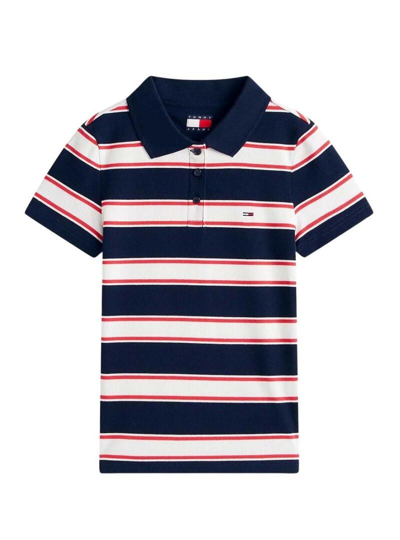 Polo Tommy Jeans. Striped print. Tessuto in cotone elasticizzato. Texture a coste. Colletto con tre bottoni. Taglio slim. Logo Tommy ricamato sul petto.