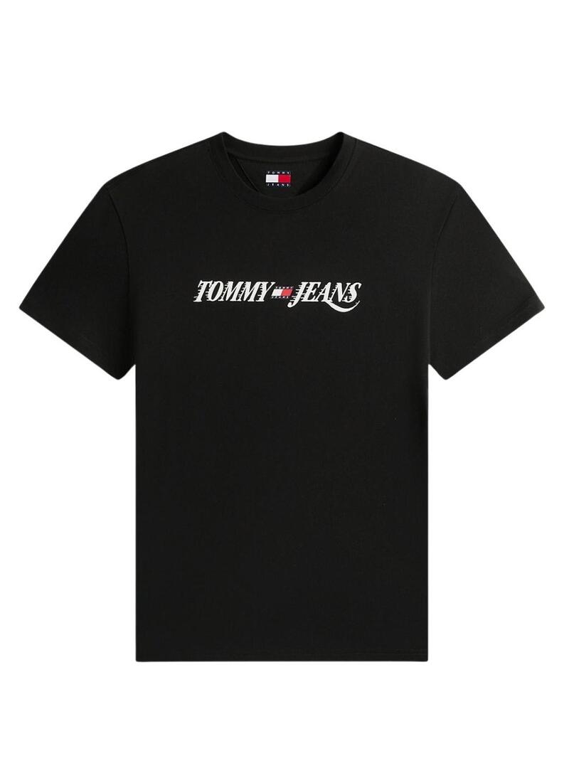 Maglietta Tommy Jeans. Colore nero. Taglio regolare. Collo rotondo a coste. Maniche corte. Logo di Tommy Jeans con tipografia vintage stampato sul petto. Il modello indossa la taglia M.