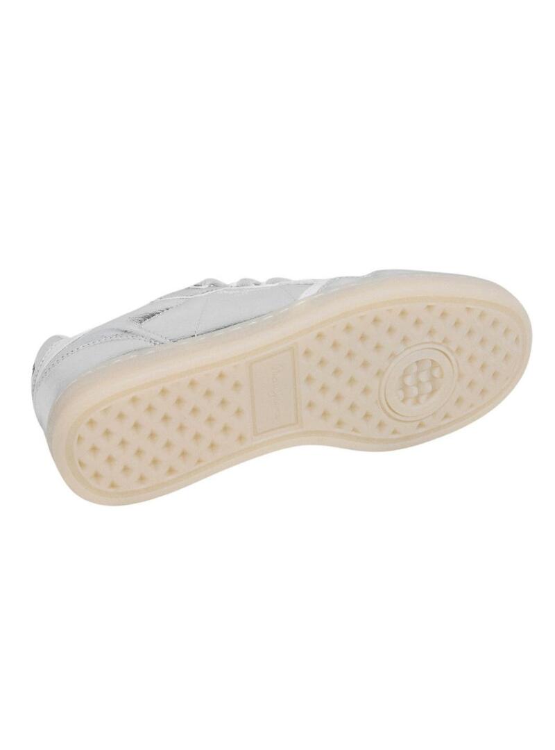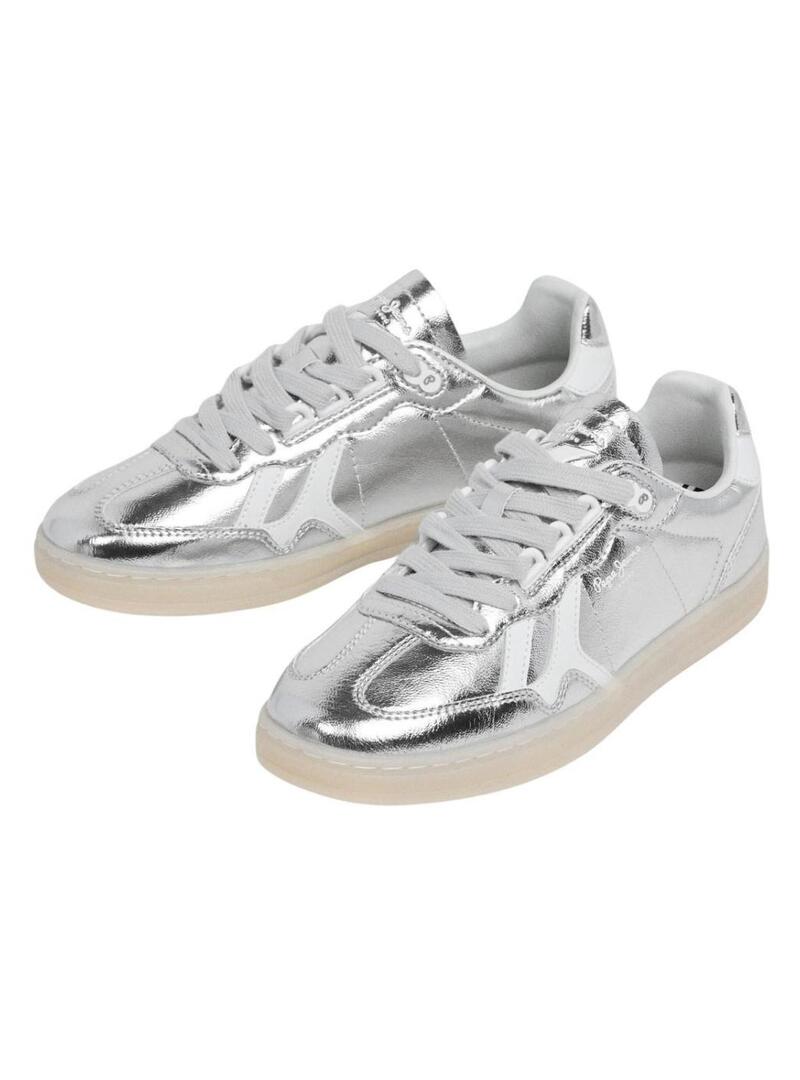 Scarpe Pepe Jeans. Modello Ball Sparkly. Argento metallizzato. Effetto pelle. Effetto metallizzato su tutta la superficie. Chiusura con lacci e anelli a forma di D. Logo termosaldato sui lati. Soletta termoformata e removibile. Linee dinamiche in contrasto sui lati. Tallone in contrasto con logo in rilievo. Suola cupsole in gomma traslucida. Non lavare in lavatrice.