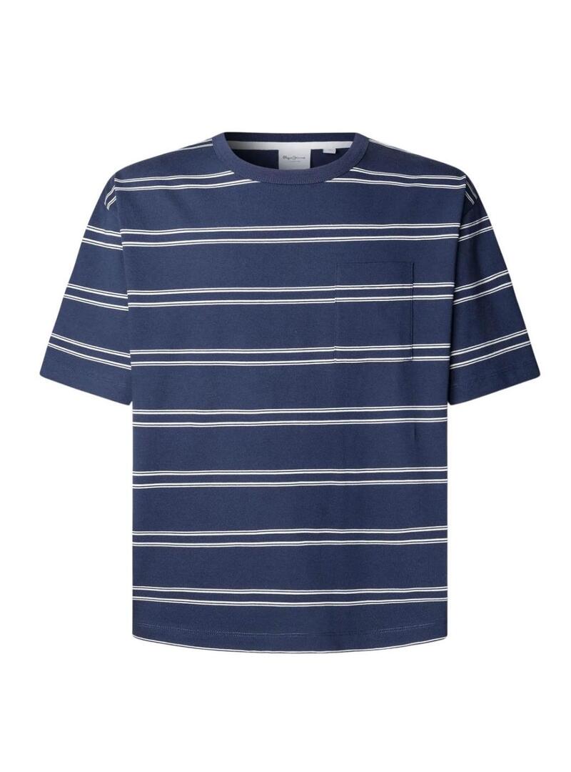 Maglietta Pepe Jeans. Modello Clark. Colore blu. Motivo a righe. Vestibilità regolare. Taglio dritto. Colletto a coste rotondo. Manica corta. Tasca sul petto.