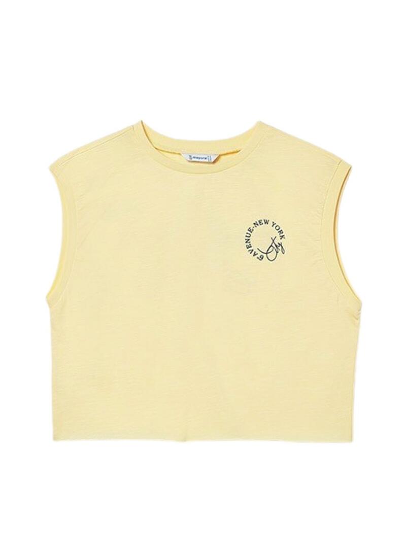 Maglietta Mayoral. Colore giallo. Con spalline per ragazza. Collo rotondo. Maniche corte. Stampa sul davanti e sul retro.