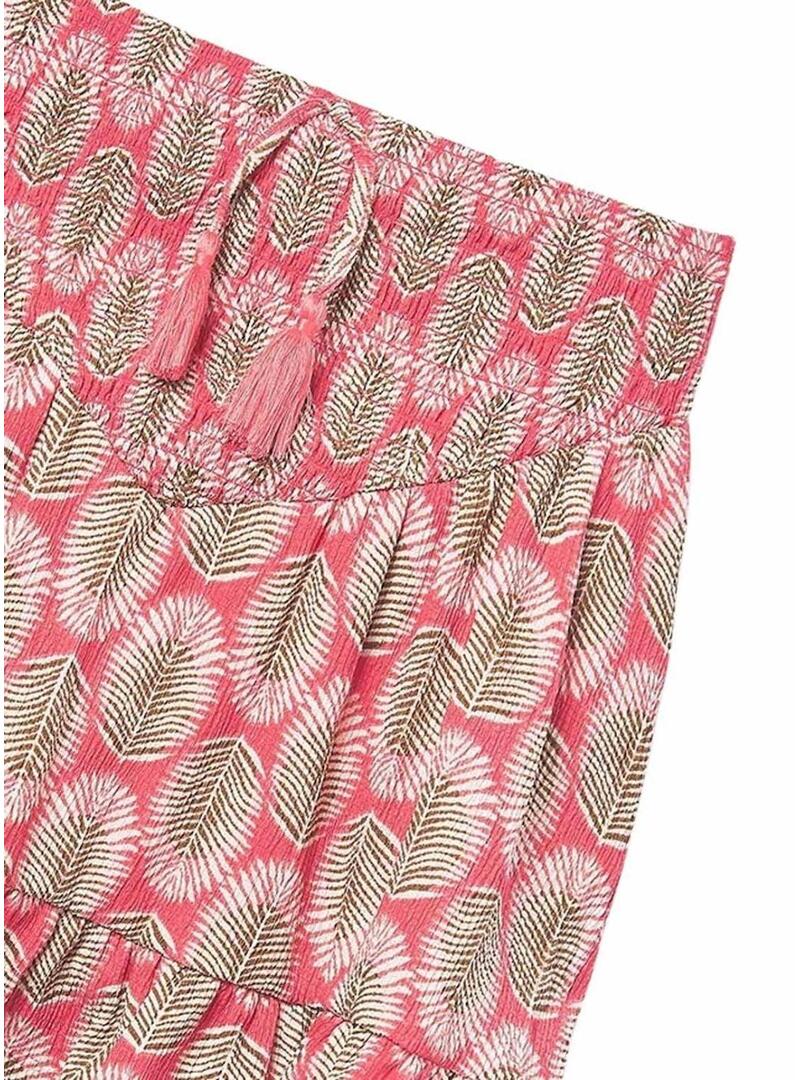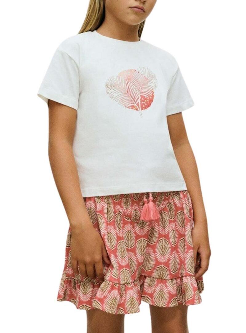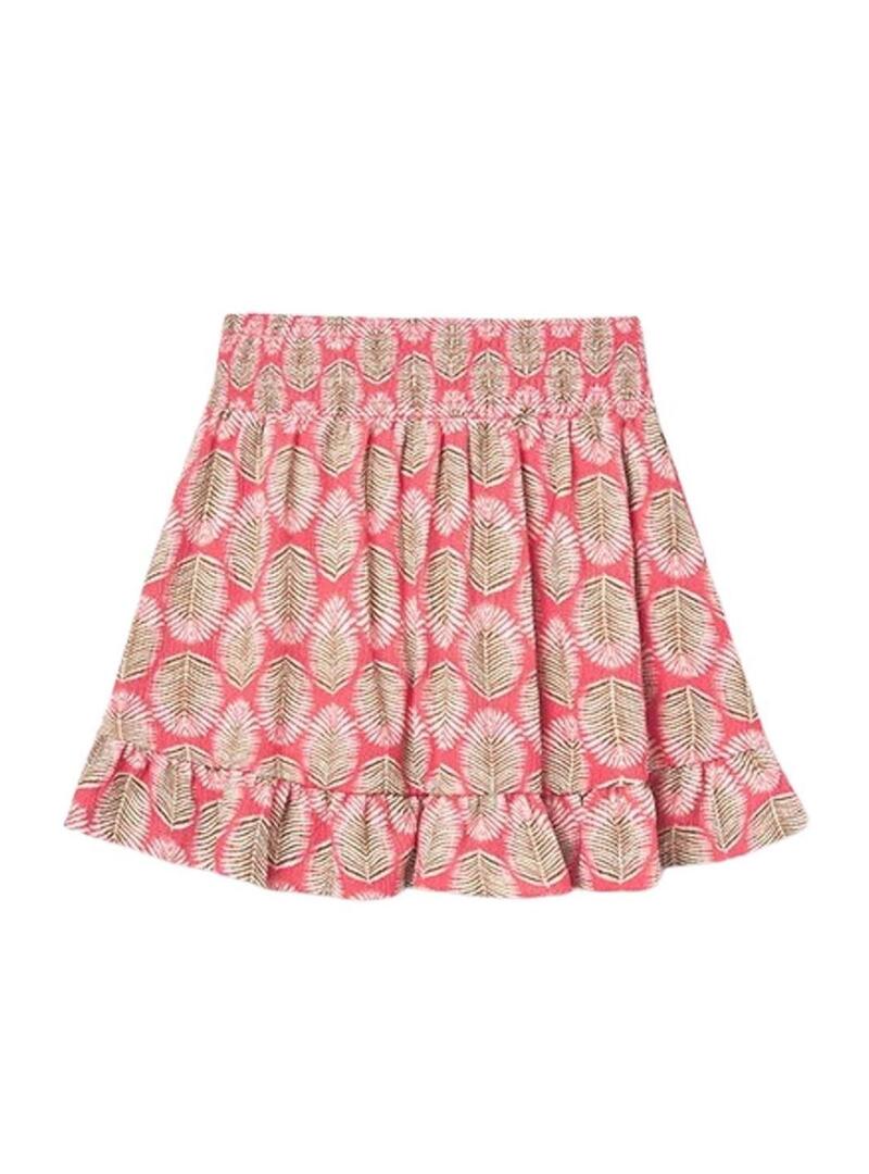 Gonna Mayoral. Colore corallo. Stampato con foglie. Vita elastica. Fiocco decorativo. Volant sul fondo. Taglio fluido. Stile a-linea.