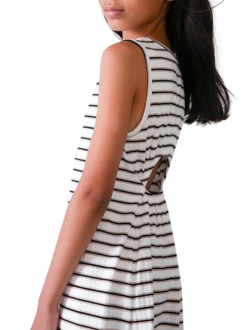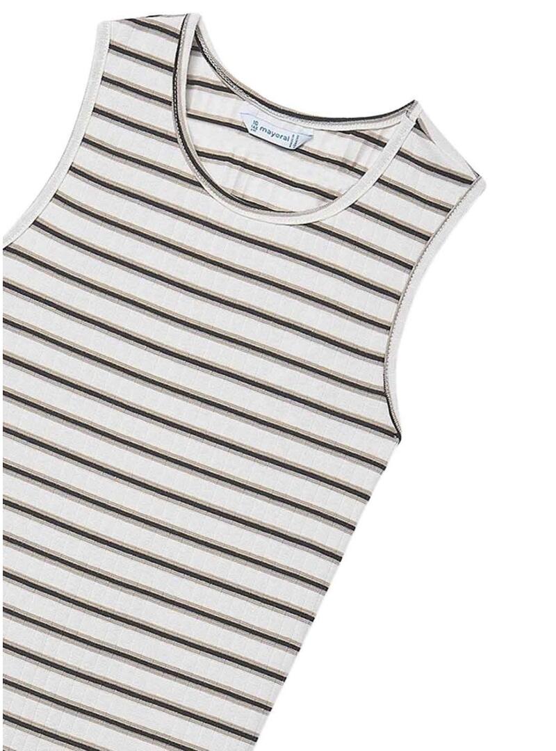 Vestito Mayoral. Costine. Colore crema. Strisce nere. Collo rotondo. Senza maniche. Lunghezza midi. Aperture laterali in basso. Schiena con apertura. Taglio aderente.